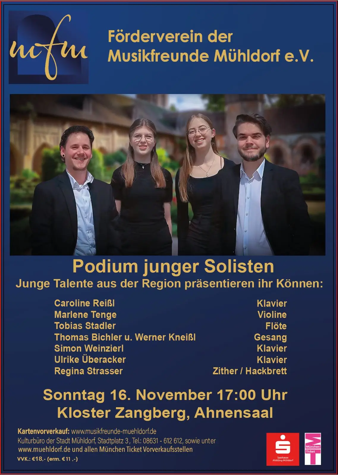 Die Musikfreunde Mühldorf laden am Sonntag, 16. November 2025, um 17:00 Uhr in den Ahnensaal Zangberg zum „Podium junger Solisten“ ein. Junge Musikerinnen und Musiker aus der Region, die derzeit Musik studieren, präsentieren ein abwechslungsreiches Programm.